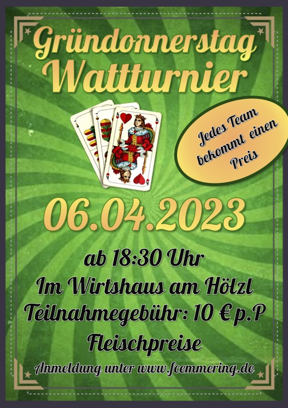 Wattturnier am Gründonnerstag - am 06. April 2023 findet im Wirtshaus am Hölzl ein Wattturnier statt. Los geht es um 18:30 Uhr (Anmeldung bis spätestens 18:00 Uhr). Anmeldegebühr sind 10 EUR pro Person. Fleischpreise gibt es für jedes Team. Meldet euch schon jetzt an und sichert euch einen Startplatz. Hier gehts zur Anmeldung