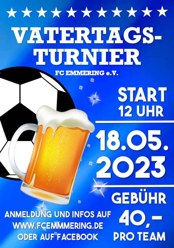 Vatertagsturnier am 18. Mai 2023 - nach dem Erfolg vom letzten Jahr findet auch in diesem Jahr wieder unser Vatertagsturnier bei uns im Hölzl-Stadion statt. Mit einem Ü30-Kleinfeld-Freizeit-Turnier wollen wir mit euch den Vatertag gemeinsam in sportlich-lockerer Atmosphäre verbringen.