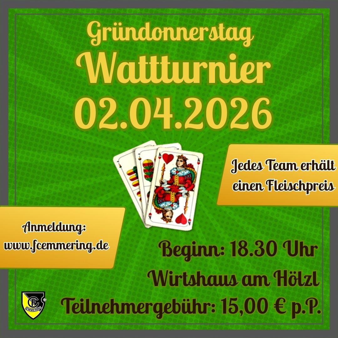 Seit einigen Jahren gehört das Wattturnier des FC Emmering am Gründonnerstag fest zum Vereinskalender und hat sich längst zu einer echten Tradition entwickelt. Jahr für Jahr dürfen wir uns über ein volles Haus im gemütlichen FCE-Stüberl am Hölzl-Stadion und viele begeisterte Wattspieler freuen. Auch heuer sind wieder alle Kartenfreunde herzlich eingeladen, einen geselligen Abend bei spannenden Partien zu verbringen. Natürlich geht niemand leer aus: Jeder Teilnehmer erhält einen Fleischpreis.